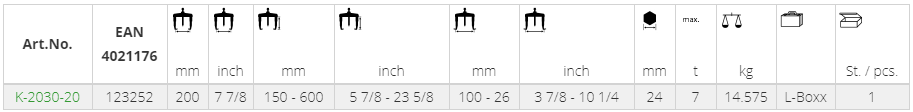- Bộ cảo cơ khí Kukko K-2030-20 là bộ cảo đa năng dạng nhỏ, tổ hợp của cảo 2 chấu và 3 chấu, có sức móc 7 tấn, độ mở max: 200 mm, chiều cao chân cảo: 150/600 mm, độ móc trong max: 100/260 mm.