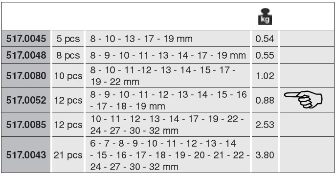 - Bộ cờ lê miệng hở/tròng KS Tools 517.0052, KS Tools combination wrench set 517.0052 gồm 12 chiếc cờ lê miệng hở/tròng, có size: 8 - 19 mm, được đóng trong khay cắm nhựa, sử dụng trong công nghiệp lắp ráp, bảo dưỡng, service.