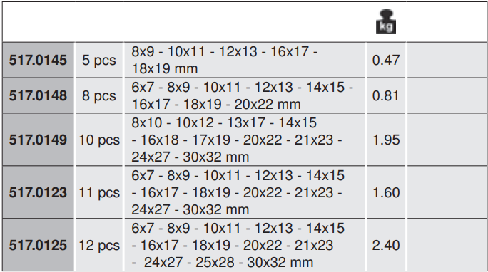 - Bộ cờ lê 2 đầu hở KS Tools 517.0145, KS Tools wrench set 517.0145 gồm 5 chi tiết cờ lê miệng hở hai đầu (8x9 - 18x19mm), được đóng trong hộp nhựa, sử dụng trong công nghiệp lắp ráp, bảo dưỡng, service.