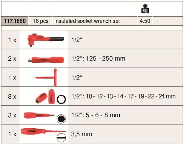 - Bộ dụng cụ cách điện KS Tools 117.1860, bộ khẩu cách điện KS Tools 117.1860 là hộp dụng cụ 16 chi tiết, gồm khẩu chụp bulong, khẩu kéo dài: 1/2",tô vít cách điện, chuyên dùng trong môi trường điện cao thế (< 1.000 V).