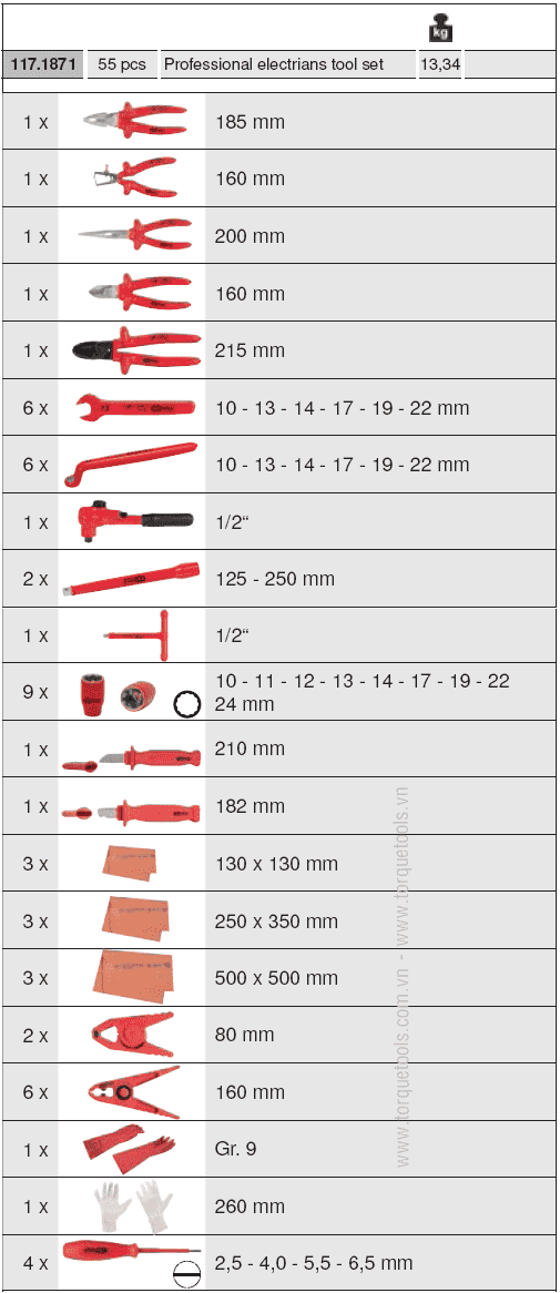 - Bộ dụng cụ cách điện KS Tools 117.1871, KS Tools VDE tools set 117.1871 là hộp dụng cụ 55 chi tiết cách điện, gồm khẩu chụp bulong 1/2", kìm, tô vít, dao rạch, kẹp cách điện, găng tay cách điện...chuyên dùng trong môi trường điện cao thế (< 1.000 V).