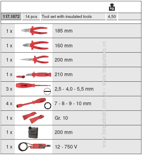 - Bộ dụng cụ cách điện KS Tools 117.1872, KS Tools VDE tools set 117.1872 là hộp dụng cụ 14 chi tiết cách điện, gồm kìm, tô vít, dao, kẹp cách điện, găng tay cách điện.. chuyên dùng trong môi trường điện cao thế (< 1.000 V).