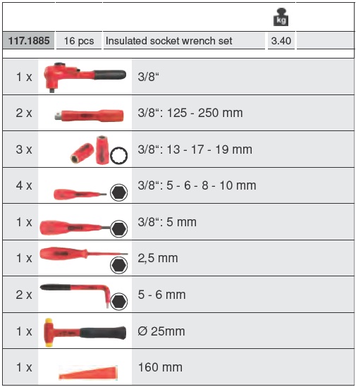- Bộ dụng cụ cách điện KS Tools 117.1885, bộ khẩu cách điện KS Tools 117.1885 là hộp dụng cụ 16 chi tiết, gồm khẩu chụp bulong, khẩu kéo dài, khẩu cắm vít 3/8", chuyên dùng trong môi trường điện cao thế (< 1.000 V).