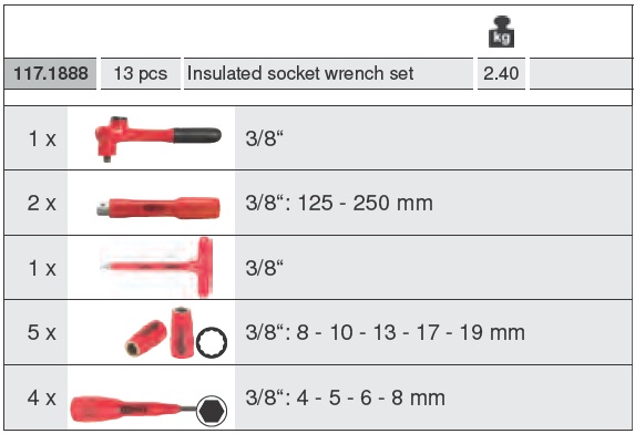 - Bộ dụng cụ cách điện KS Tools 117.1888, bộ khẩu cách điện KS Tools 117.1888 là hộp dụng cụ 13 chi tiết, gồm khẩu chụp bulong, khẩu kéo dài, khẩu cắm vít 3/8", chuyên dùng trong môi trường điện cao thế (< 1.000 V).