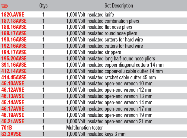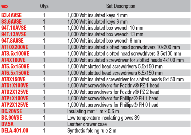 - Bộ dụng cụ cách điện Facom 2184C.VSE , bộ khẩu cách điện Facom 2184C.VSE là hộp dụng cụ 41 chi tiết, gồm các loại tô vít, kìm, cờ lê vòng miệng, đồng hồ đo, găng tay cách điện.