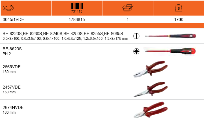 - Bộ dụng cụ cách điện Bahco 3045/1VDE , Bahco VDE tools set 3045/1VDE là hộp dụng cụ 10 chi tiết, gồm các loại kìm, tô vít 2 cạnh, tô vít 4 cạnh cách điện, chuyên dùng cho môi trường điện cao thế (1.000 V).
