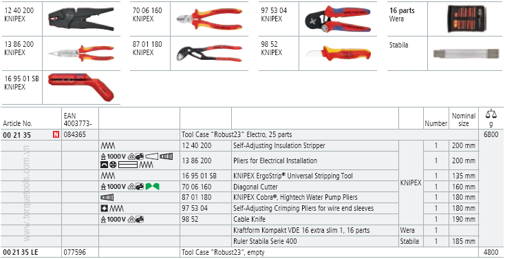 Toàn bộ dụng cụ Knipex 00 21 35 đóng trong valy nhựa, trọng lượng: 6.8 kg. Made in Germany.