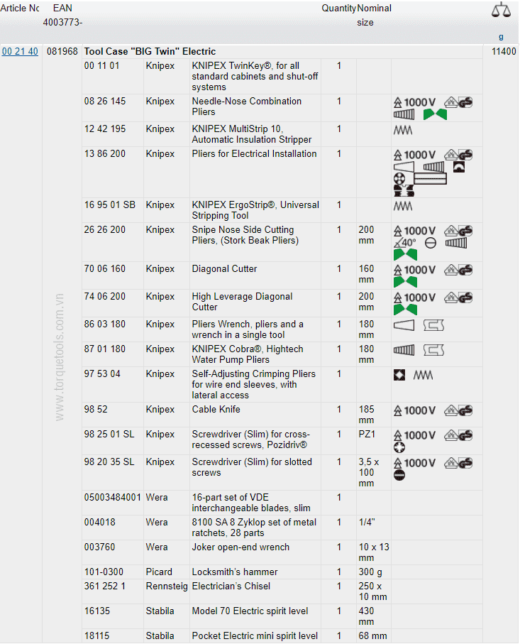 Toàn bộ dụng cụ Knipex 00 21 40 đóng trong hộp nhựa, trọng lượng: 11.4 kg. Made in Germany.