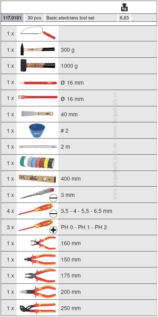 - Bộ dụng cụ cách điện KS Tools 117.0181, KS Tools VDE tools set 117.0181 là hộp dụng cụ 30 chi tiết cách điện, gồm kìm, tô vít cách điện, đục, cưa tay cách điện, chuyên dùng trong môi trường điện cao thế (< 1.000 V).