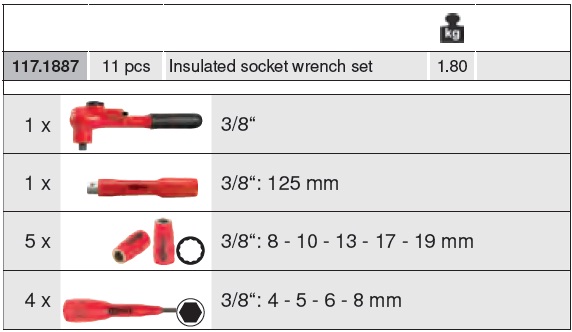 - Bộ dụng cụ cách điện KS Tools 117.1887, bộ khẩu cách điện KS Tools 117.1887 là hộp dụng cụ 11 chi tiết, gồm khẩu chụp bulong, khẩu kéo dài, tay vặn đa năng 3/8", chuyên dùng trong môi trường điện cao thế (< 1.000 V).