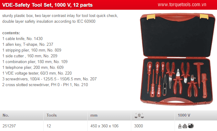 - Bộ dụng cụ cách điện Klaus Friedrich 251297, Klaus Friedrich VDE tools set 251297 gồm 12 chiếc kìm cách điện, tô vít cách điện, dao cắt cách điện chuyên dùng để siết bulong, đai ốc trong môi trường điện cao thế (< 1.000 V).