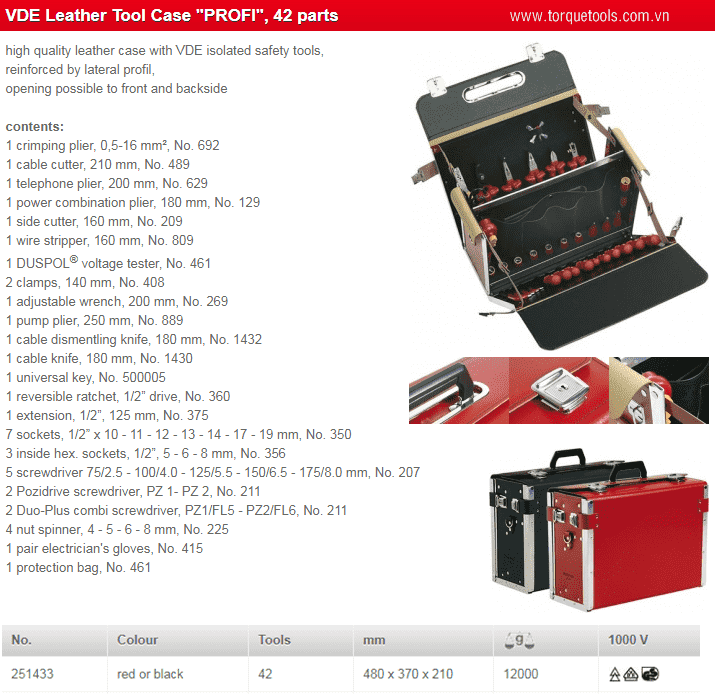 - Bộ dụng cụ cách điện Klaus Friedrich 251433, Klaus Friedrich VDE tools set 251433 gồm 42 chiếc kìm cách điện, tô vít cách điện, khẩu và tay công cách điện chuyên dùng để siết bulong, đai ốc trong môi trường điện cao thế (< 1.000 V).