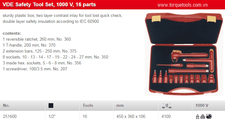 - Bộ dụng cụ cách điện Klaus Friedrich 251600, Klaus Friedrich VDE tools set 251600 gồm 16 chiếc khẩu và tay công cách điện 1/2", chuyên dùng để siết bulong, đai ốc trong môi trường điện cao thế (< 1.000 V).