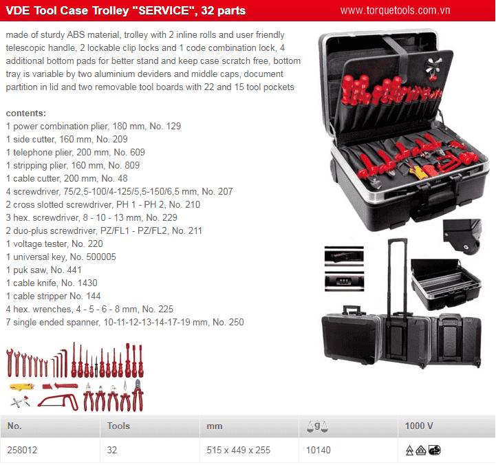 - Bộ dụng cụ cách điện Klaus Friedrich 258012, Klaus Friedrich VDE tools set 258012 gồm 32 chiếc kìm cách điện, tô vít cách điện, cờ lê cách điện chuyên dùng để siết bulong, đai ốc trong môi trường điện cao thế (< 1.000 V).
