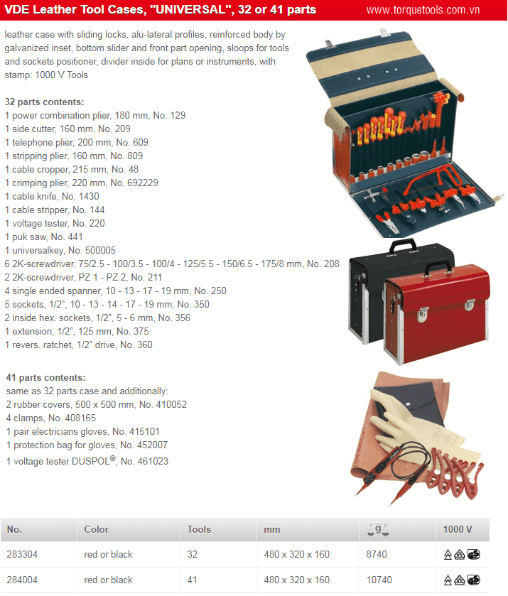 - Bộ dụng cụ cách điện Klaus Friedrich 284004, Klaus Friedrich VDE tools set 284004 gồm 41 chiếc kìm cách điện, tô vít cách điện, cờ lê cách điện, khẩu và tay công cách điện chuyên dùng để siết bulong, đai ốc trong môi trường điện cao thế (< 1.000 V).
