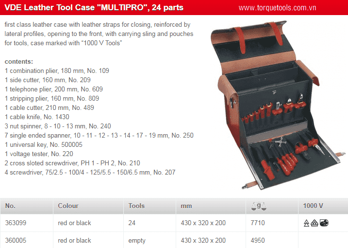 - Bộ dụng cụ cách điện Klaus Friedrich 363099, Klaus Friedrich VDE tools set 363099 gồm 24 chiếc kìm cách điện, tô vít cách điện, cờ lê cách điện, chuyên dùng để siết bulong, đai ốc trong môi trường điện cao thế (< 1.000 V).