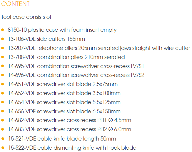 Các chi tiết trong bộ dụng cụ cách điện Bernstein 8190-VDE gồm: