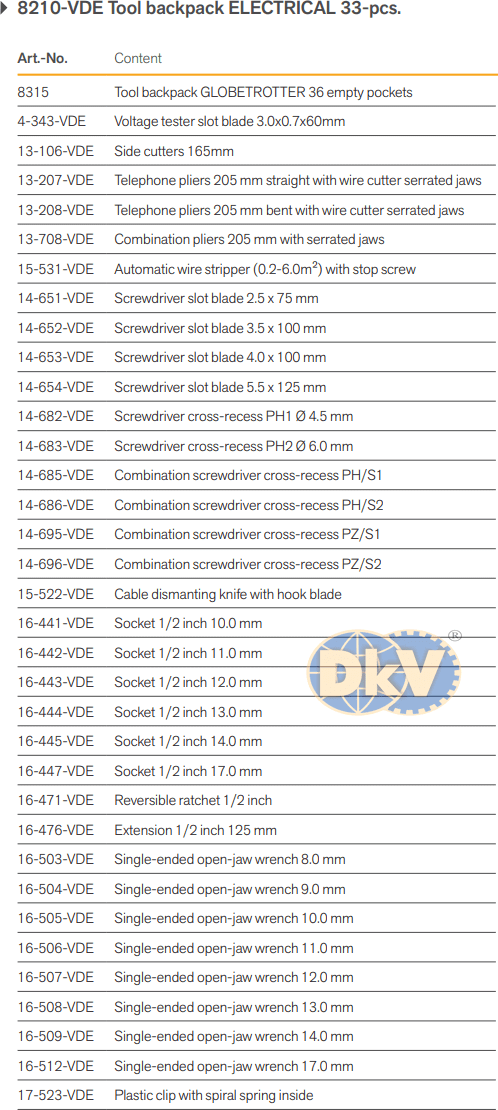 - Bộ dụng cụ cách điện Bernstein 8210-VDE, Bernstein VDE tools set 8210-VDE: là hộp dụng cụ 33 chi tiết cách điện, gồm kìm, cờ lê, tay công, tô vít, dao rạch cách điện...chuyên dùng trong môi trường điện cao thế (< 1.000 V).