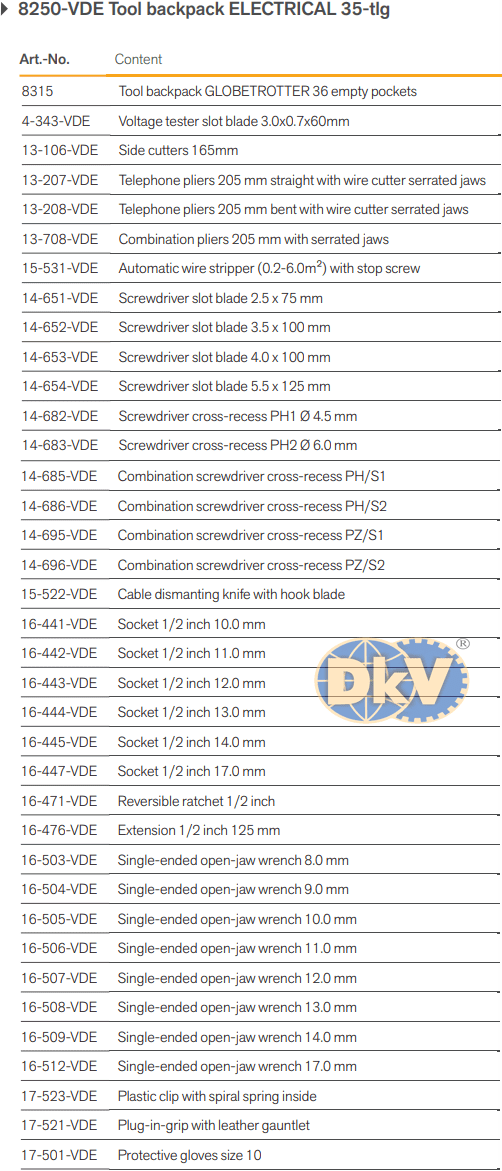 Các chi tiết trong bộ dụng cụ cách điện Bernstein 8250-VDE gồm: