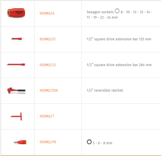 - Bộ dụng cụ cách điện Beta 920MQ/C16, Beta VDE tools set 920MQ/C16: gồm 16 chiếc khẩu 6 cạnh, khẩu vít, khẩu kéo dài, tay công... chuyên dùng để siết bulong, đai ốc trong môi trường điện cao thế (< 1.000 V).