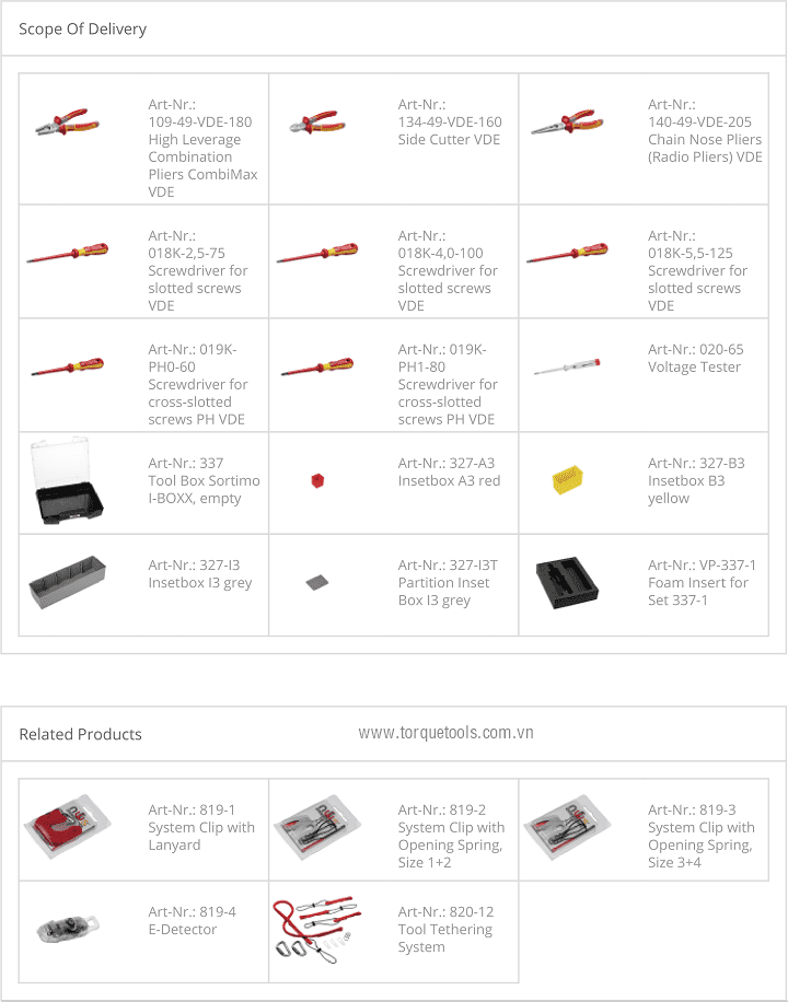 Bộ dụng cụ cách điện NWS 337-1, NWS VDE tools set 337-1: có 10 chi tiết, chuyên dùng để siết vít trong môi trường điện cao thế < 1.000 V. Các chi tiết trong bộ dụng cụ cách điện NWS 337-1 gồm:
