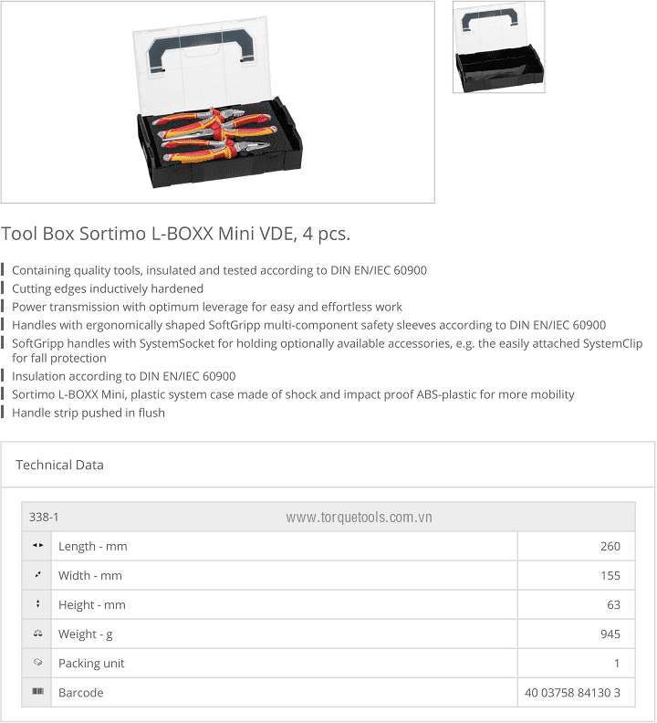 Bộ dụng cụ cách điện NWS 338-1, NWS VDE tools set 338-1: có 4 chi tiết, chuyên dùng để siết vít trong môi trường điện cao thế < 1.000 V. Các chi tiết trong bộ dụng cụ cách điện NWS 338-1 gồm: