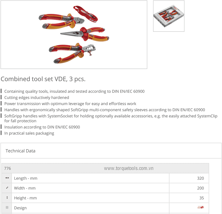 Bộ dụng cụ cách điện NWS 776, NWS VDE tools set 776: có 3 chi tiết, chuyên dùng để siết vít trong môi trường điện cao thế < 1.000 V. Các chi tiết trong bộ dụng cụ cách điện NWS 776 gồm: