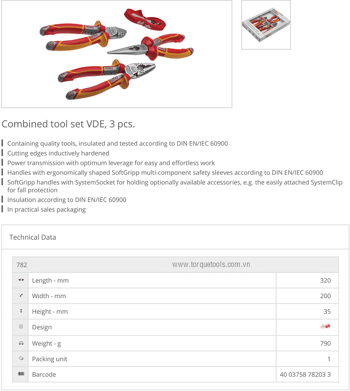Bộ dụng cụ cách điện NWS 782, NWS VDE tools set 782: có 3 chi tiết, chuyên dùng để siết vít trong môi trường điện cao thế < 1.000 V. Các chi tiết trong bộ dụng cụ cách điện NWS 782 gồm: