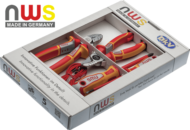 Toàn bộ bộ dụng cụ cách điện NWS 787 đóng trong hộp carton. Made in Germany.