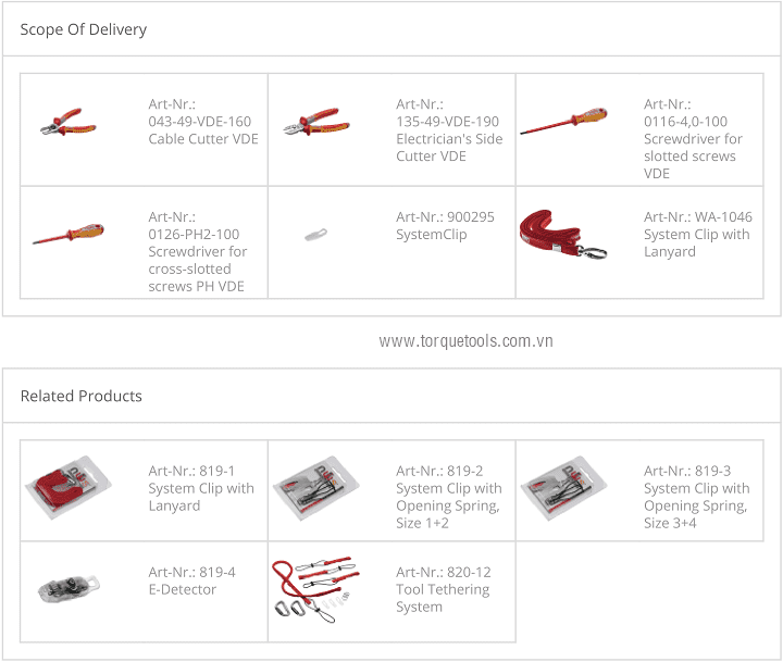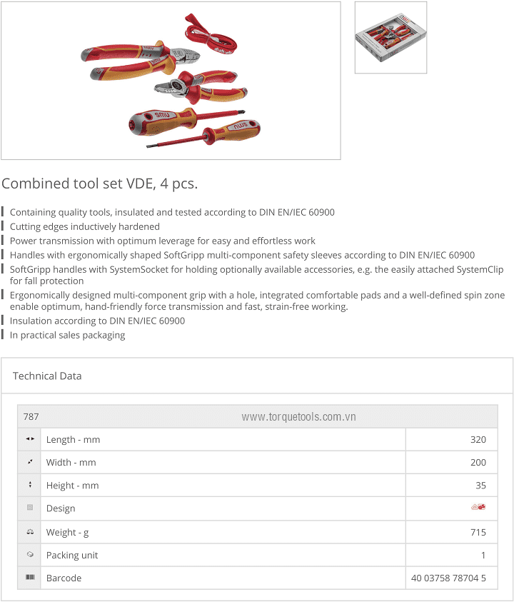 Bộ dụng cụ cách điện NWS 787, NWS VDE tools set 787: có 4 chi tiết, chuyên dùng để siết vít trong môi trường điện cao thế < 1.000 V. Các chi tiết trong bộ dụng cụ cách điện NWS 787 gồm:
