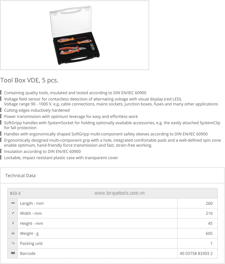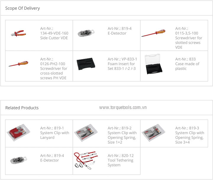 Bộ dụng cụ cách điện NWS 833-3, NWS VDE tools set 833-3: có 5 chi tiết, chuyên dùng để siết vít trong môi trường điện cao thế < 1.000 V. Các chi tiết trong bộ dụng cụ cách điện NWS 833-3 gồm: