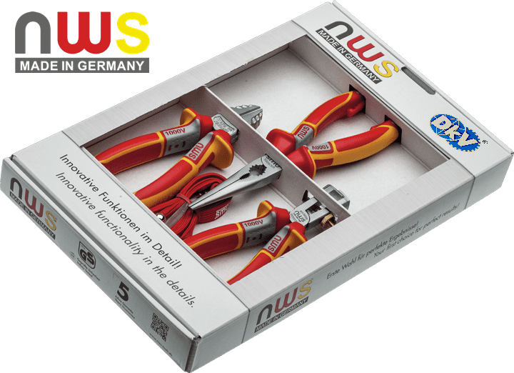 Toàn bộ bộ dụng cụ cách điện NWS 833-4 đóng trong hộp carton. Made in Germany.