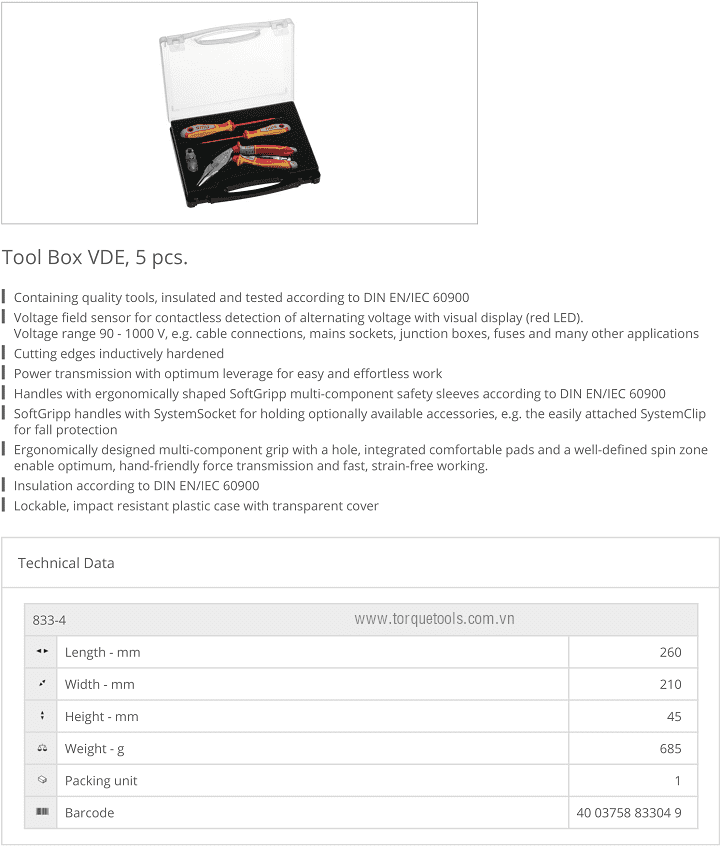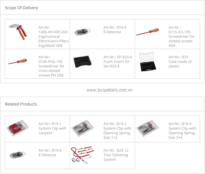 Bộ dụng cụ cách điện NWS 833-4, NWS VDE tools set 833-4: có 5 chi tiết, chuyên dùng để siết vít trong môi trường điện cao thế < 1.000 V. Các chi tiết trong bộ dụng cụ cách điện NWS 833-4 gồm: