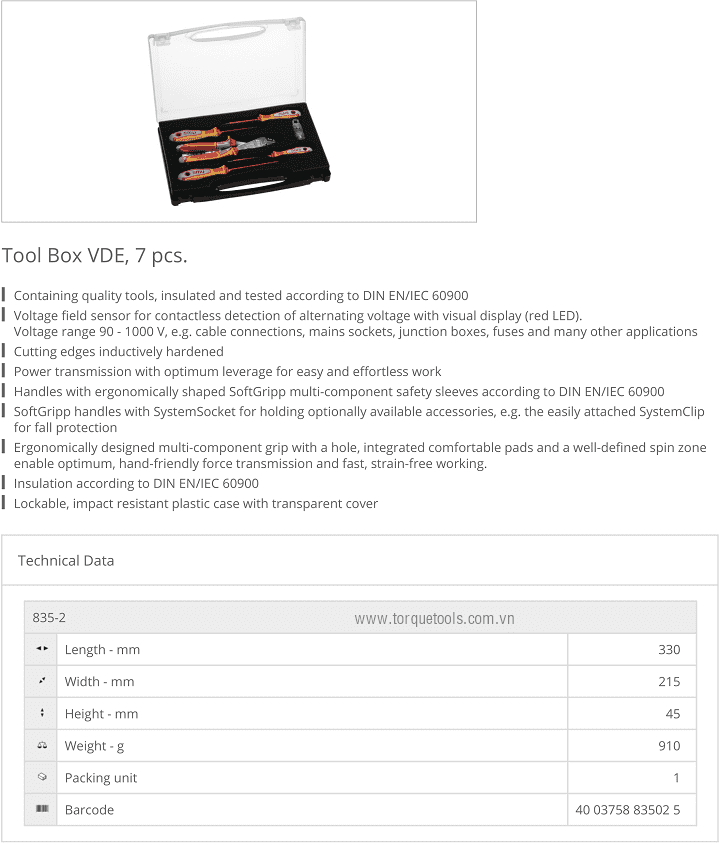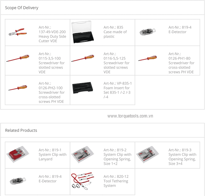 Bộ dụng cụ cách điện NWS 835-2, NWS VDE tools set 835-2: có 7 chi tiết, chuyên dùng để siết vít trong môi trường điện cao thế < 1.000 V. Các chi tiết trong bộ dụng cụ cách điện NWS 835-2 gồm: