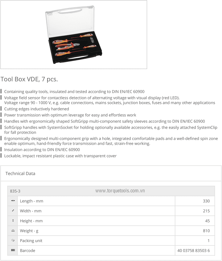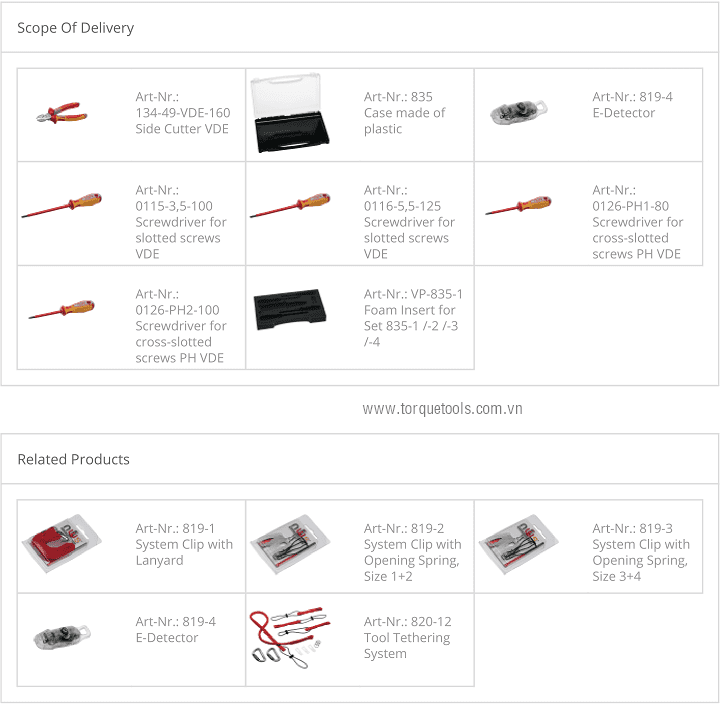 Bộ dụng cụ cách điện NWS 835-3, NWS VDE tools set 835-3: có 7 chi tiết, chuyên dùng để siết vít trong môi trường điện cao thế < 1.000 V. Các chi tiết trong bộ dụng cụ cách điện NWS 835-3 gồm: