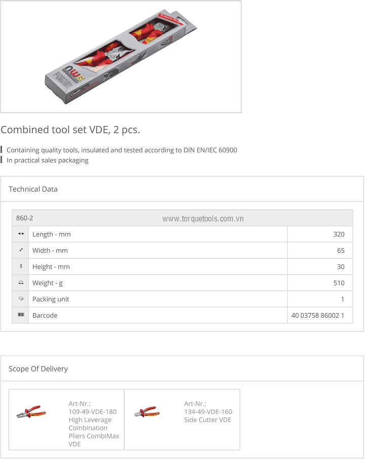 Bộ dụng cụ cách điện NWS 860-2, NWS VDE tools set 860-2: có 2 chi tiết, chuyên dùng để siết vít trong môi trường điện cao thế < 1.000 V. Các chi tiết trong bộ dụng cụ cách điện NWS 860-2 gồm: