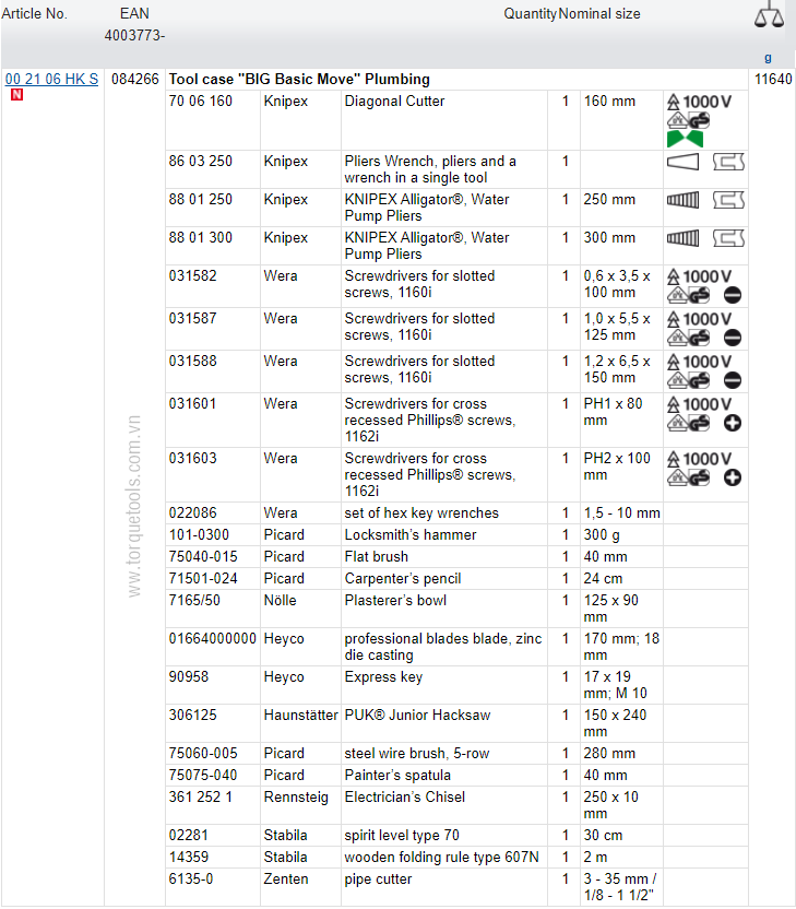 Toàn bộ dụng cụ Knipex 00 21 06 HK S đóng trong hộp nhựa, trọng lượng: 11.64 kg. Made in Germany.