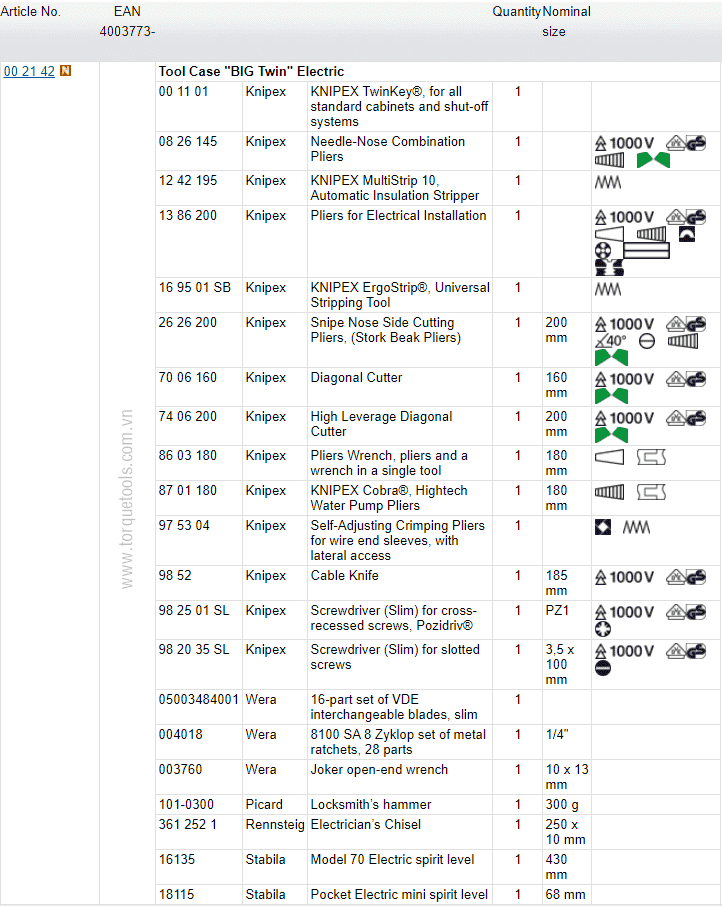 Toàn bộ dụng cụ Knipex 00 21 42 đóng trong hộp nhựa, trọng lượng: 11.4 kg. Made in Germany.