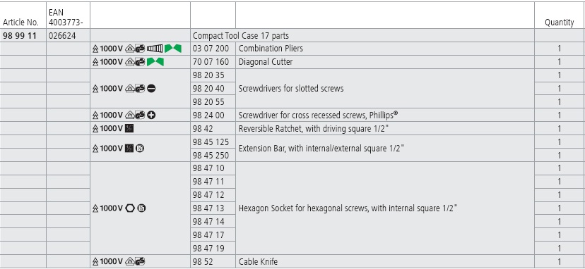 - Bộ dụng cụ cách điện Knipex 98 99 11, Knipex VDE tools set 98 99 11 là hộp dụng cụ 17 chi tiết, gồm khẩu chụp bulong (10 - 19 mm), khẩu kéo dài, kìm đa năng, kìm cắt, tô vít 2 cạnh, tô vít 4 cạnh, dao rạch, tay vặn đa năng cách điện: 1/2".