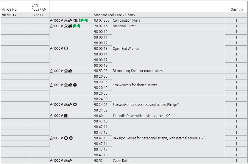 - Bộ dụng cụ cách điện Knipex 98 99 12, Knipex VDE tools set 98 99 12 là hộp dụng cụ 26 chi tiết, gồm khẩu chụp bulong (10 - 19 mm), cờ lê vòng miệng (10 - 19 mm), kìm đa năng, kìm cắt, tô vít 2 cạnh, tô vít 4 cạnh, dao rạch, tay vặn chữ T đa năng cách điện: 1/2".