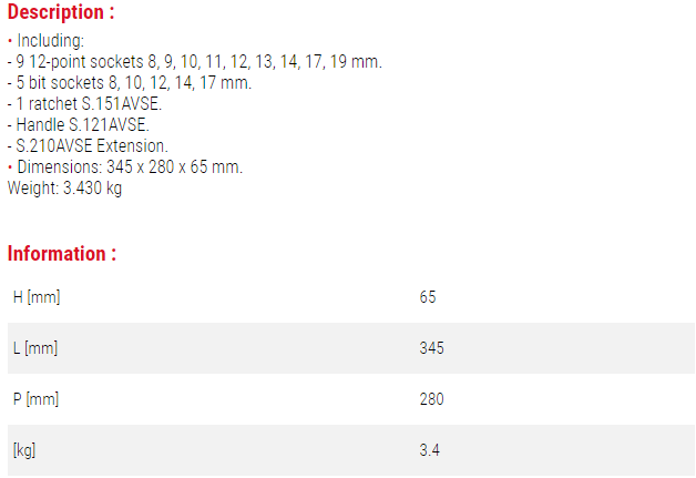 - Bộ dụng cụ cách điện Facom S.401AVSE , bộ khẩu cách điện Facom S.401AVSE là hộp dụng cụ 17 chi tiết, gồm 9 khẩu chụp bulong 12 cạnh 8 - 19 mm, 5 khẩu cắm lục 8 - 17 mm, 1 khẩu kéo dài, 1 tay chữ T và 1 tay vặn đa năng 1/2".