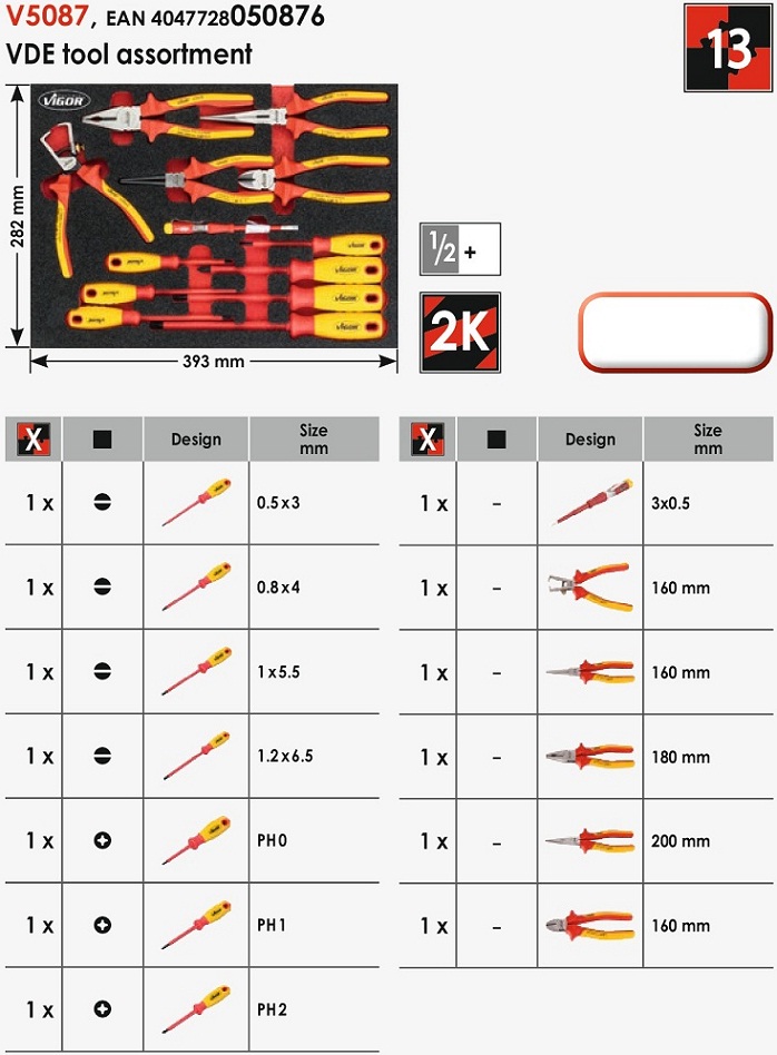 - Bộ dụng cụ cách điện Vigor V5087, Vigor VDE soft foam inserts V5087 gồm 13 chiếc tô vít, kìm cách điện ,được đóng trên khay xốp.