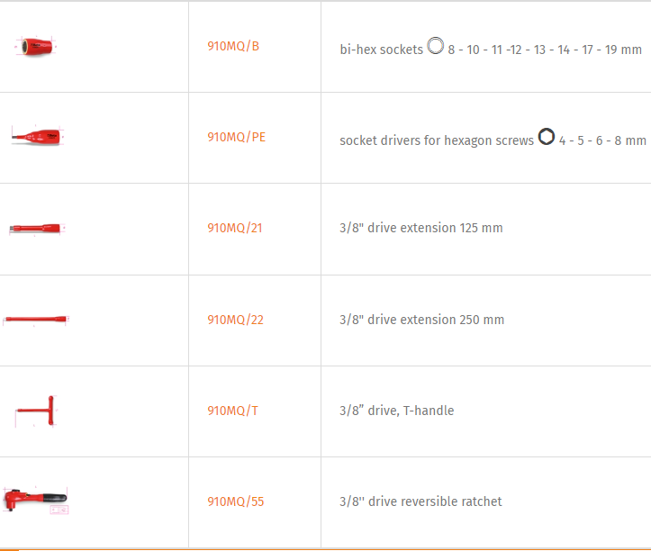 - Bộ dụng cụ cách điện Beta 910MQ/C16, Beta VDE tools set 910MQ/C16: gồm 16 chiếc khẩu 6 cạnh, khẩu vít, khẩu kéo dài, tay công... size: 3/8" chuyên dùng để siết bulong, đai ốc trong môi trường điện cao thế (< 1.000 V).