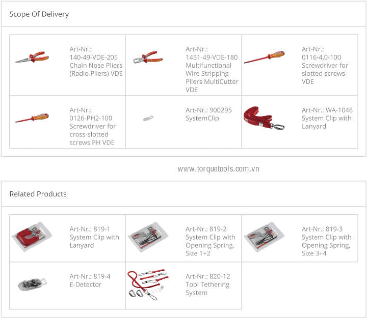 Bộ dụng cụ cách điện NWS 785, NWS VDE tools set 785: có 4 chi tiết, chuyên dùng để siết vít trong môi trường điện cao thế < 1.000 V. Các chi tiết trong bộ dụng cụ cách điện NWS 785 gồm: