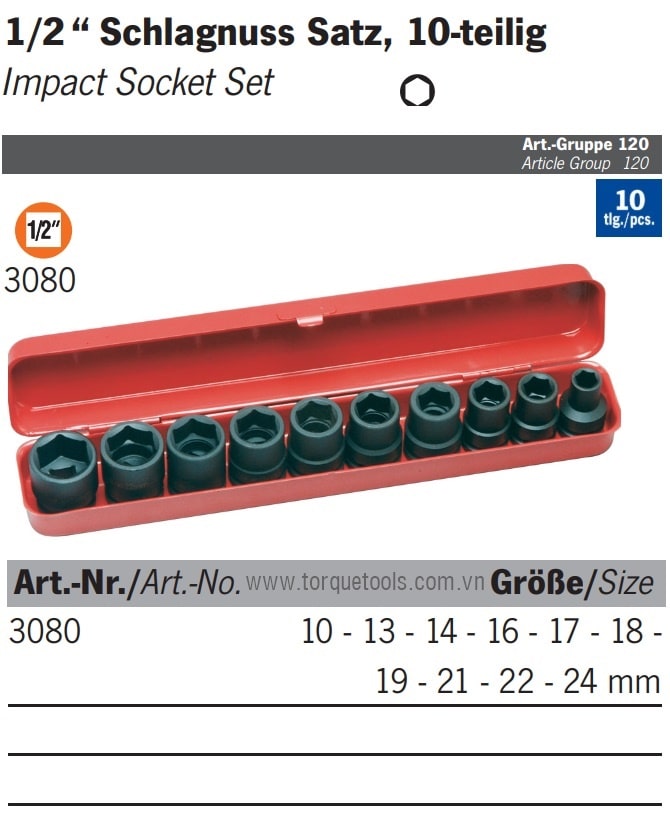 - Khẩu 1/2", 6 cạnh (10 - 24 mm): 8 chiếc.
