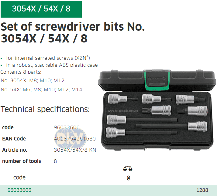 Bộ dụng cụ Stahlwille 3054X/54X/8, bộ khẩu Stahlwille 3054X/54X/8 (Code: 96033606) là hộp dụng cụ 8 chi tiết, size khẩu đầu vào 1/2", chuyên dùng để siết/vặn bulong, đai ốc, vít trong công nghiệp.Các chi tiết trong bộ khẩu Stahlwille 3054X/54X/8 gồm: