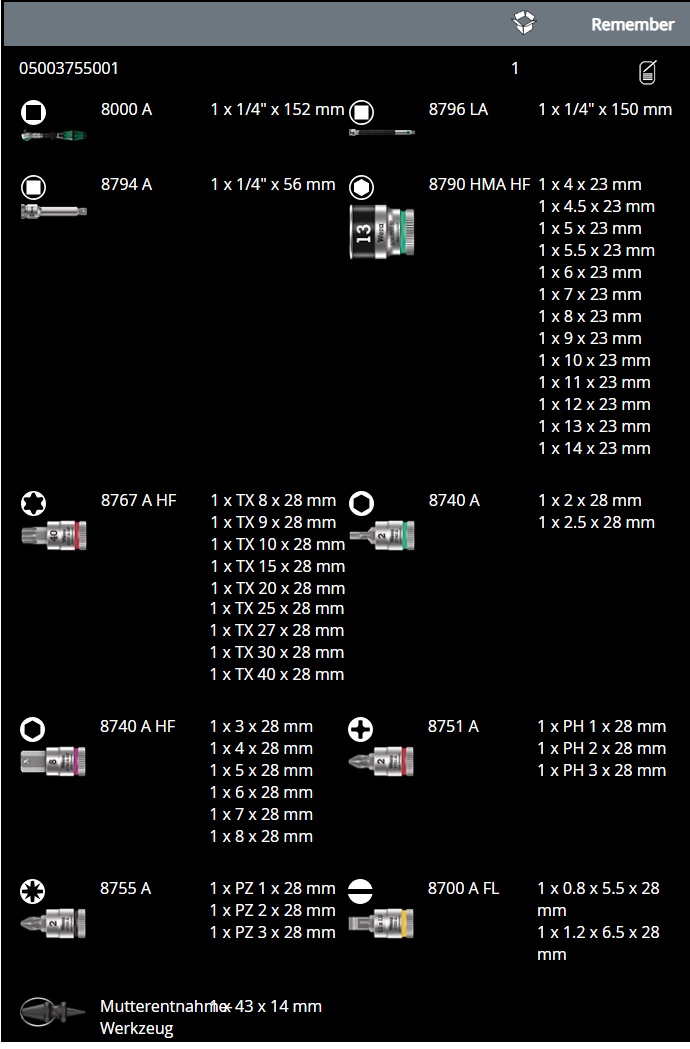 - Bộ dụng cụ Wera 05003755001, bộ khẩu Wera 05003755001 là hộp dụng cụ 42 chi tiết, trong đó có 13 khẩu 1/4" loại ngắn (4 - 14 mm), ba khẩu kéo dài và một tay vặn đa năng và các đầu vít cắm khẩu.