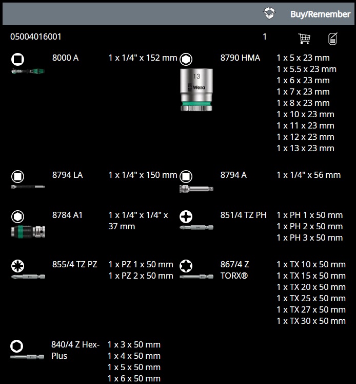 - Bộ dụng cụ Wera 05004016001, bộ khẩu Wera 05004016001 là hộp dụng cụ 28 chi tiết, trong đó có 9 khẩu 1/4" loại ngắn (5 - 13 mm), ba khẩu kéo dài và một tay vặn đa năng và các đầu vít cắm khẩu.