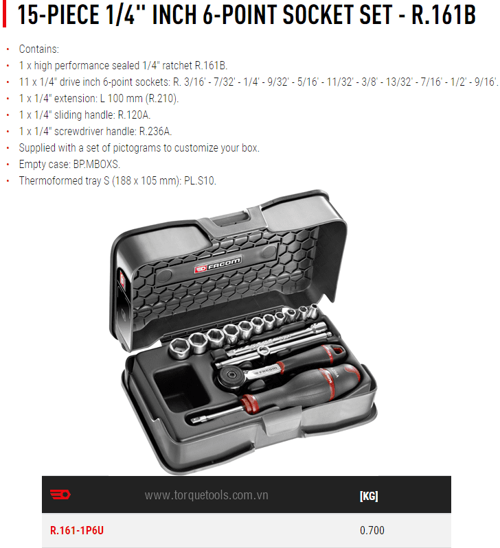 - Toàn bộ bộ khẩu Facom R.161-1P6U đóng trong hộp nhựa, trọng lượng: 0.7 kg. Made in France.
