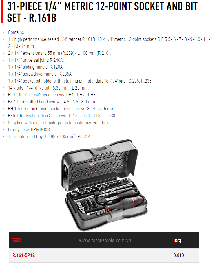 Bộ dụng cụ Facom R.161-5P12, bộ khẩu Facom R.161-5P12 là hộp dụng cụ 31 chi tiết, size khẩu đầu vào 1/4", chuyên dùng để siết/vặn bulong, đai ốc, vít trong công nghiệp.Các chi tiết trong bộ khẩu Facom R.161-5P12 gồm: